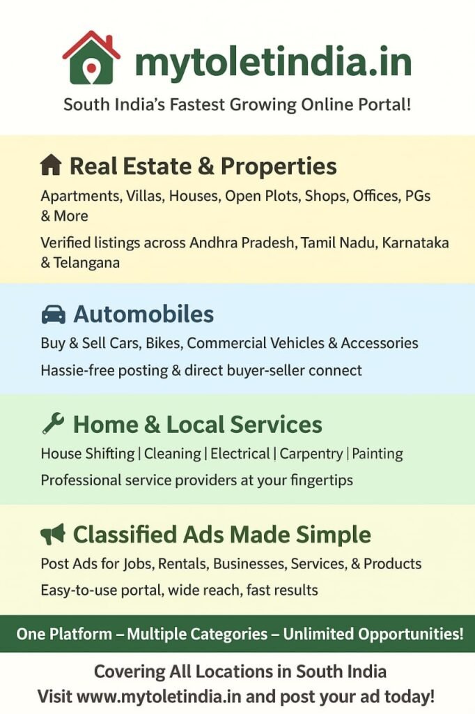 Mytoletindia deals with a variety of property categories, which can be broadly divided into residential, commercial, and land. The website serves customers looking to buy, sell, and rent properties across South India